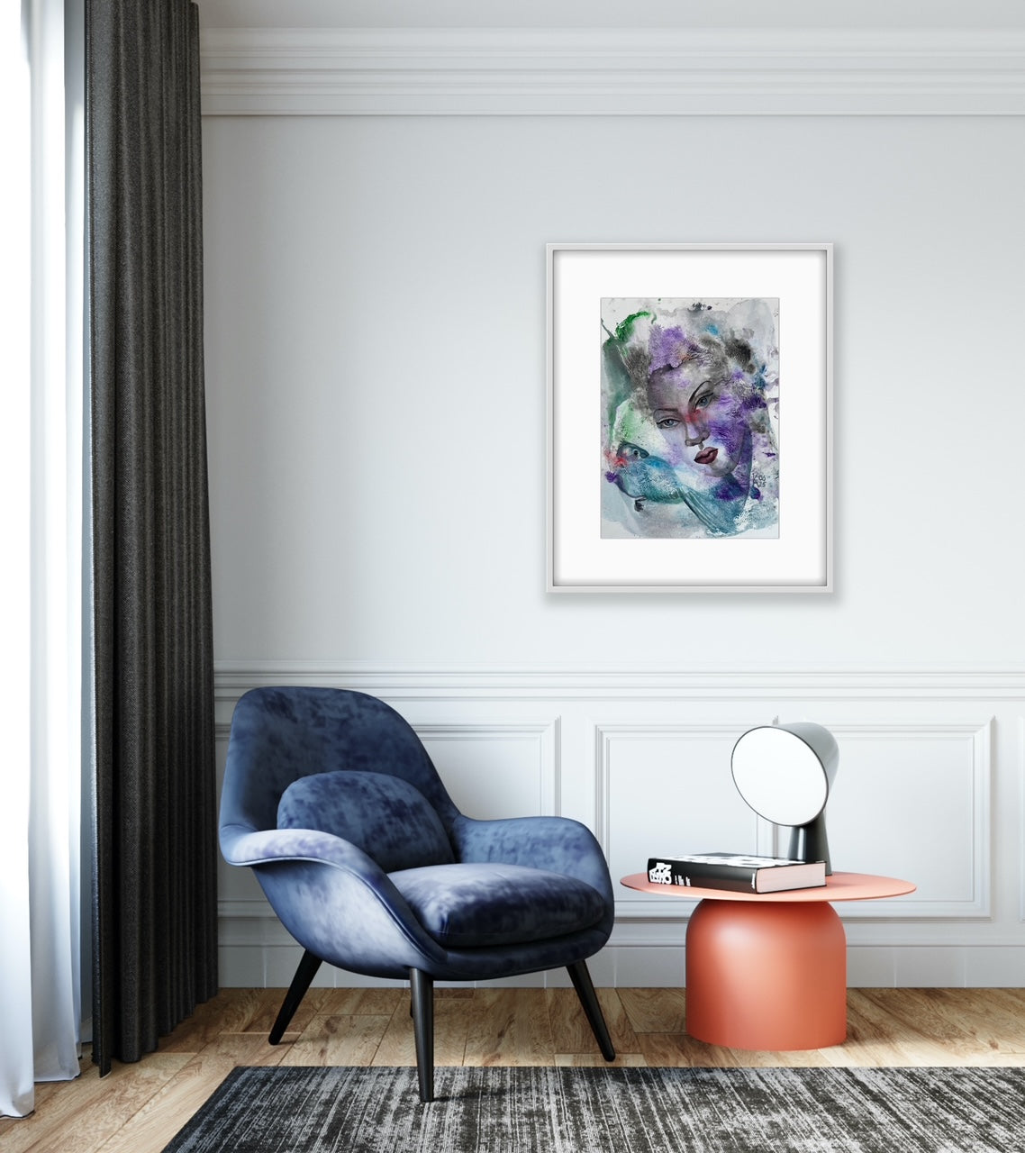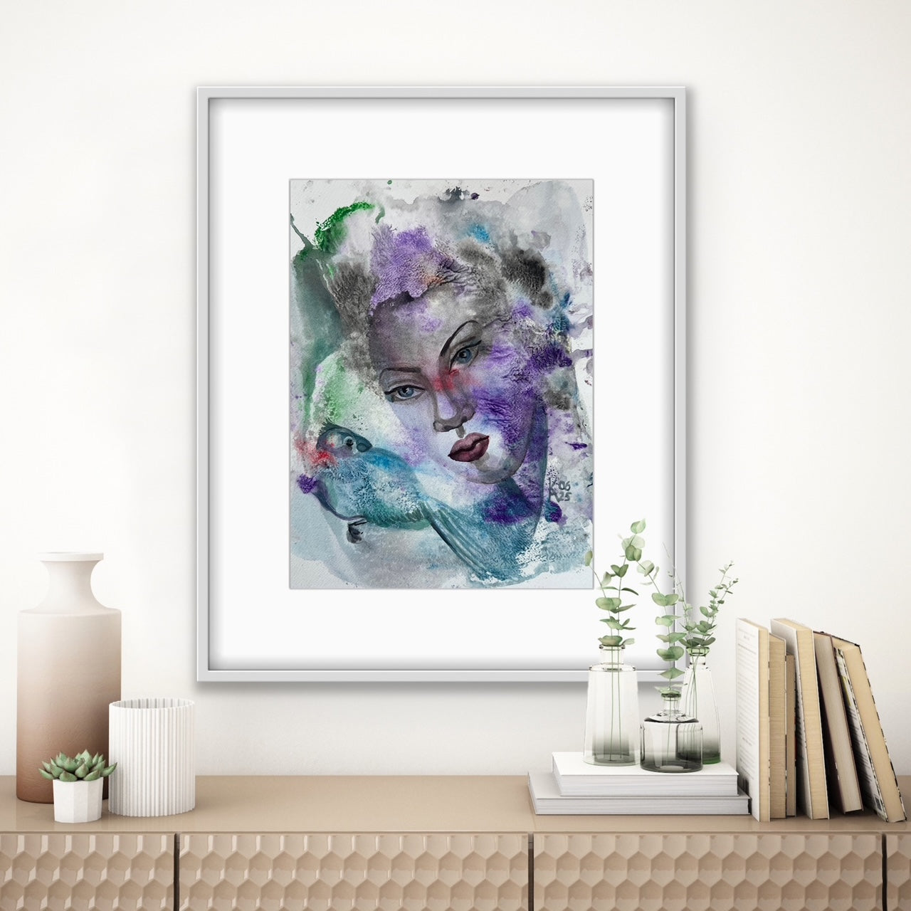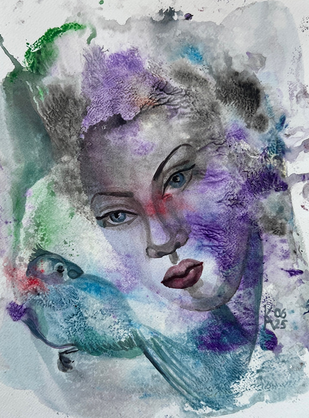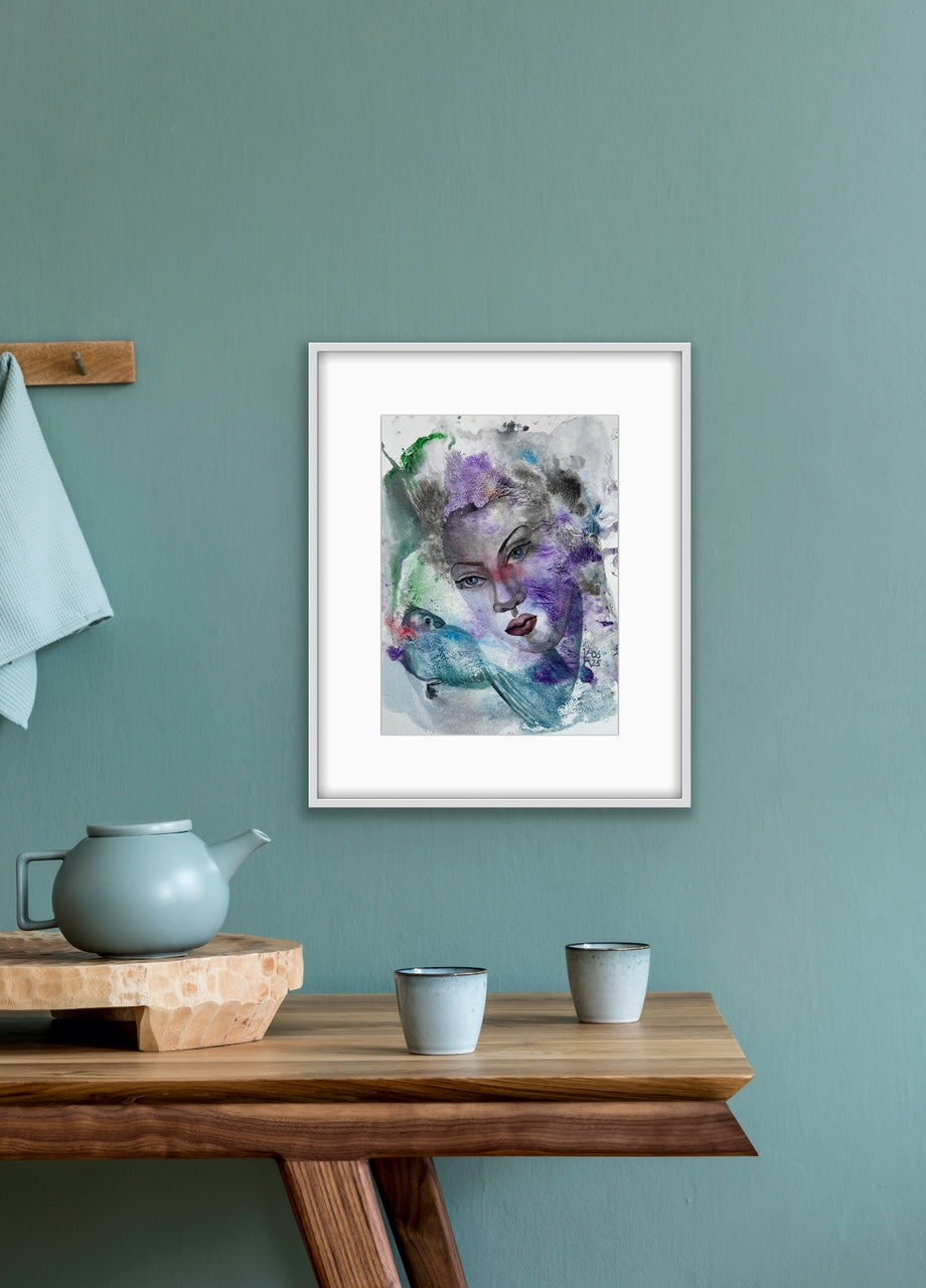 “Bird Talk” captures the fragile harmony between human emotion and the whispers of nature. A woman’s serene face merges with soft waves of violet, blue, and green, where a bird seems to speak through color and air. The painting reflects inner dialogue - between soul and instinct, silence and melody. Each watercolor layer reveals both freedom and thought, making this piece an embodiment of quiet communication with the unseen. Delicate textures and fluid transitions invite reflection and calm, balancing mystery and light.