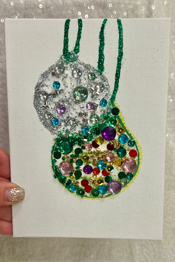 This Christmas tree is sparkling, mysterious, enigmatic, so different, yet amazing every time. Created with acrylic paint, texture, glitter and rhinestones, sequins, beads, and creative love.