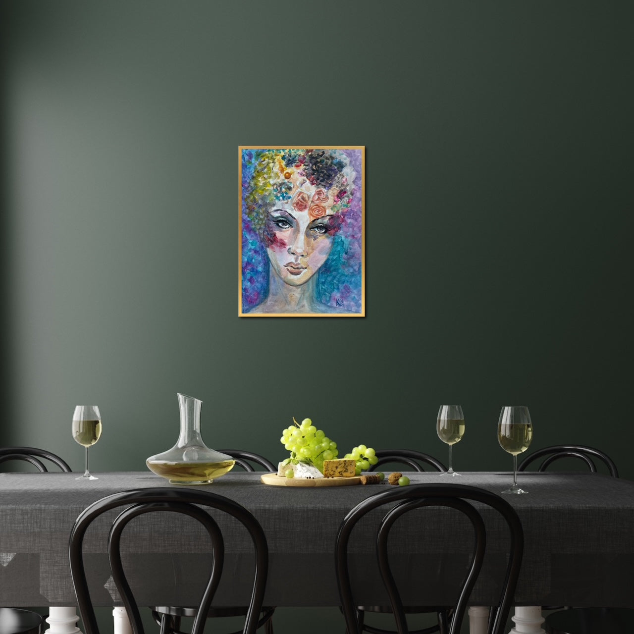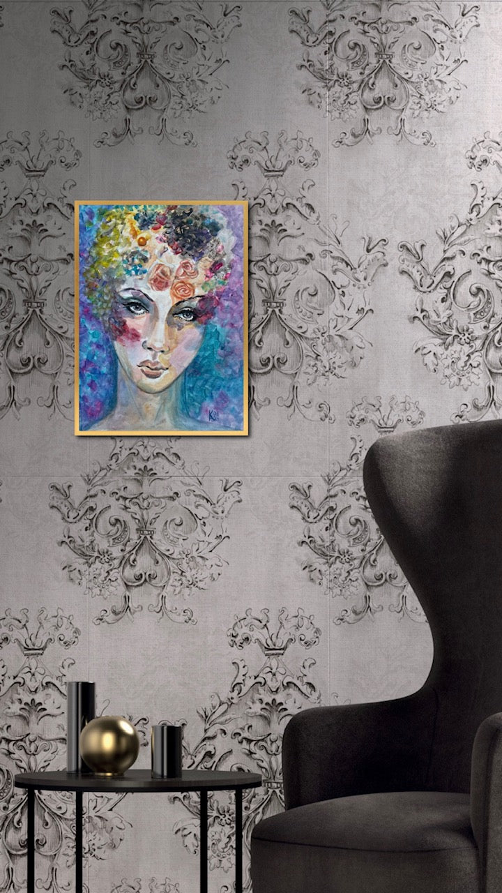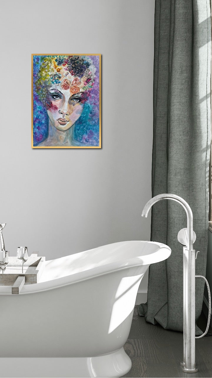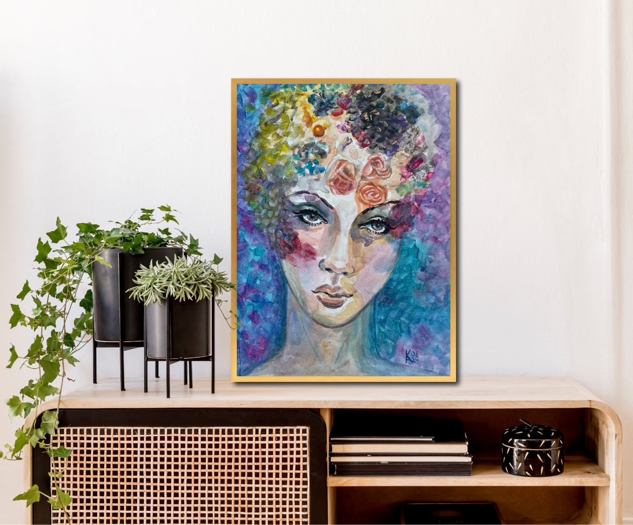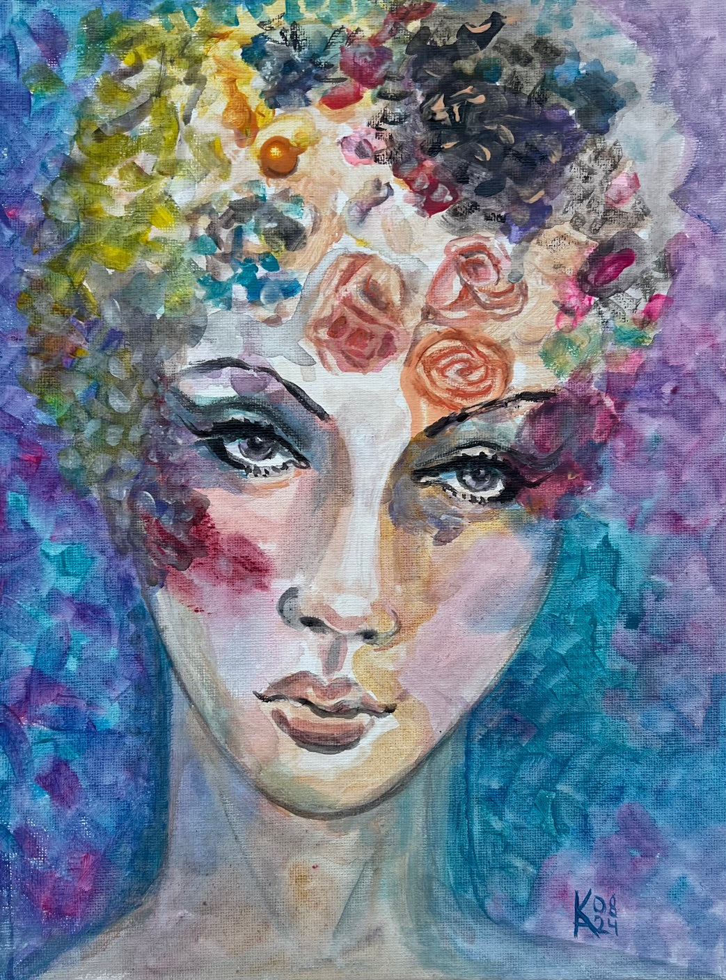 “Morning Pearl” captures the fragile awakening of feminine essence, where the face emerges from a dreamlike swirl of light, texture, and subconscious emotion. The watercolor palette blends soft lilacs, deep blues, warm golds, and floral bursts, evoking a state between night and day, vulnerability and power. Her gaze is direct, yet distant, as if holding a secret whispered by the dawn. The textured crown of roses and abstract shapes becomes a garden of thoughts - ephemeral, emotional, alive. A work that resonates with inner beauty, transformation, and silence before the first word of the day.