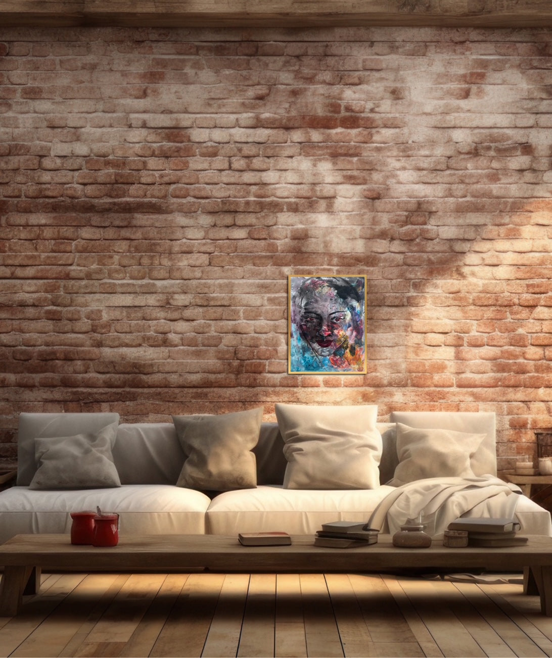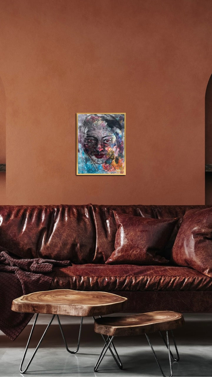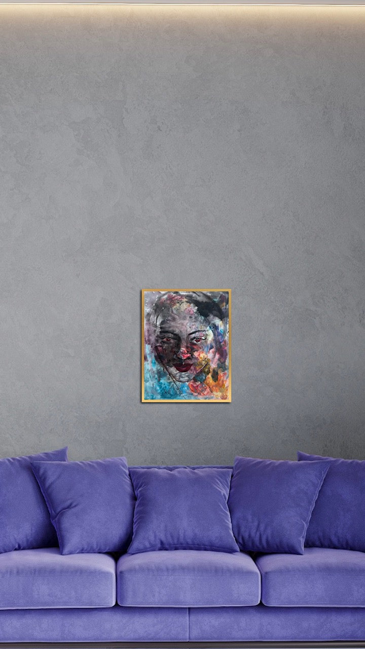 “Smiling Look” captivates with its enigmatic expression-half hidden in shadow, half lit by emotional warmth. The face emerges from a storm of layered watercolor and acrylic textures, blending violet haze, carmine reds, fiery oranges, and celestial blues. Her crimson eyes draw into a silent, knowing smile that radiates both intimacy and mystery. There's fragility in the soft blending, yet fierce energy in her stare. This portrait evokes memory, emotion, and silent connection. What stays is her gaze-deep, sly, and unforgettable-like she knows a secret never spoken.