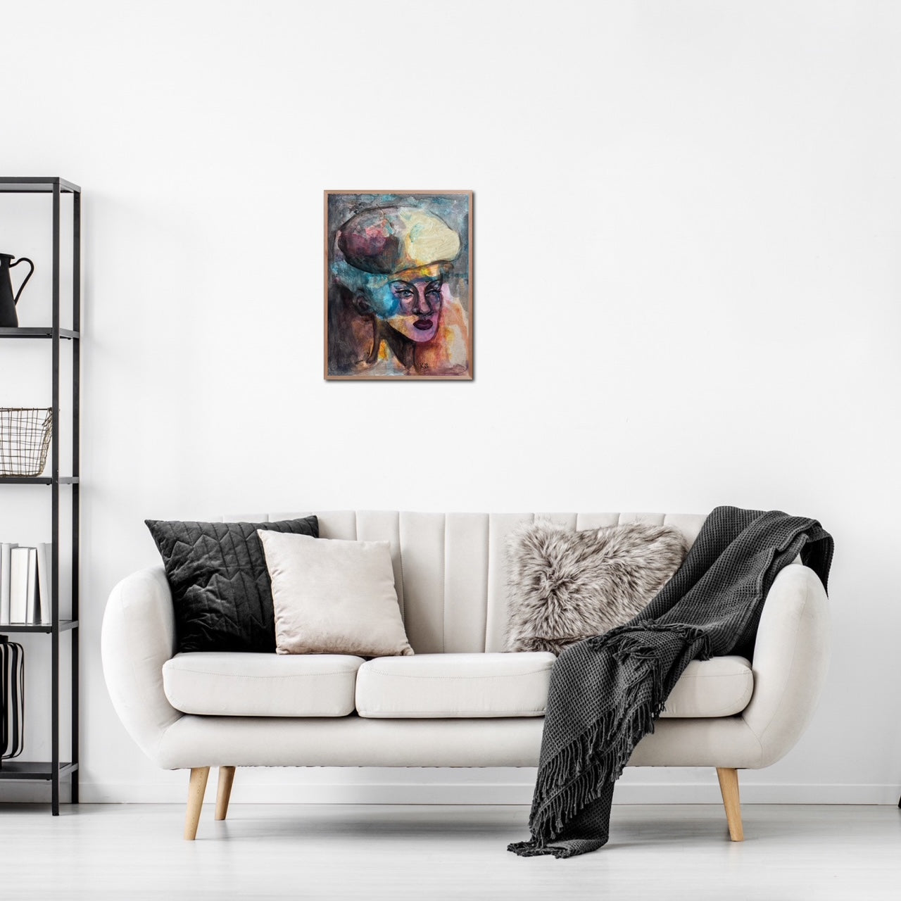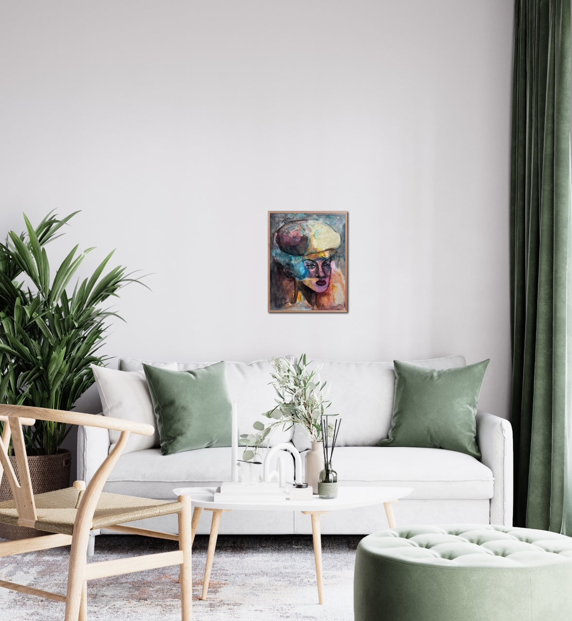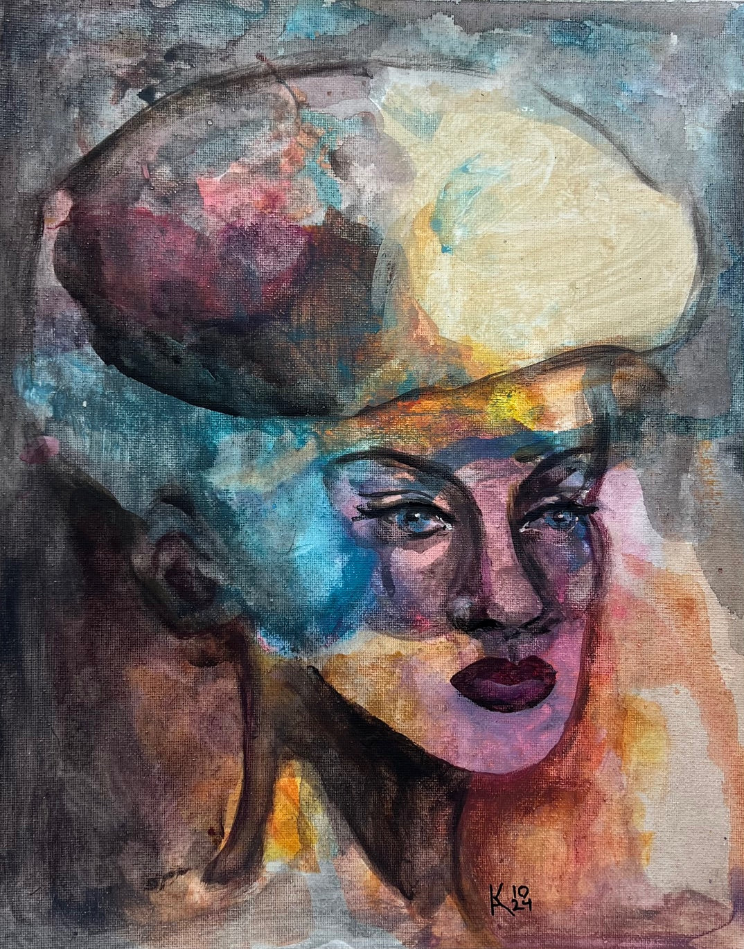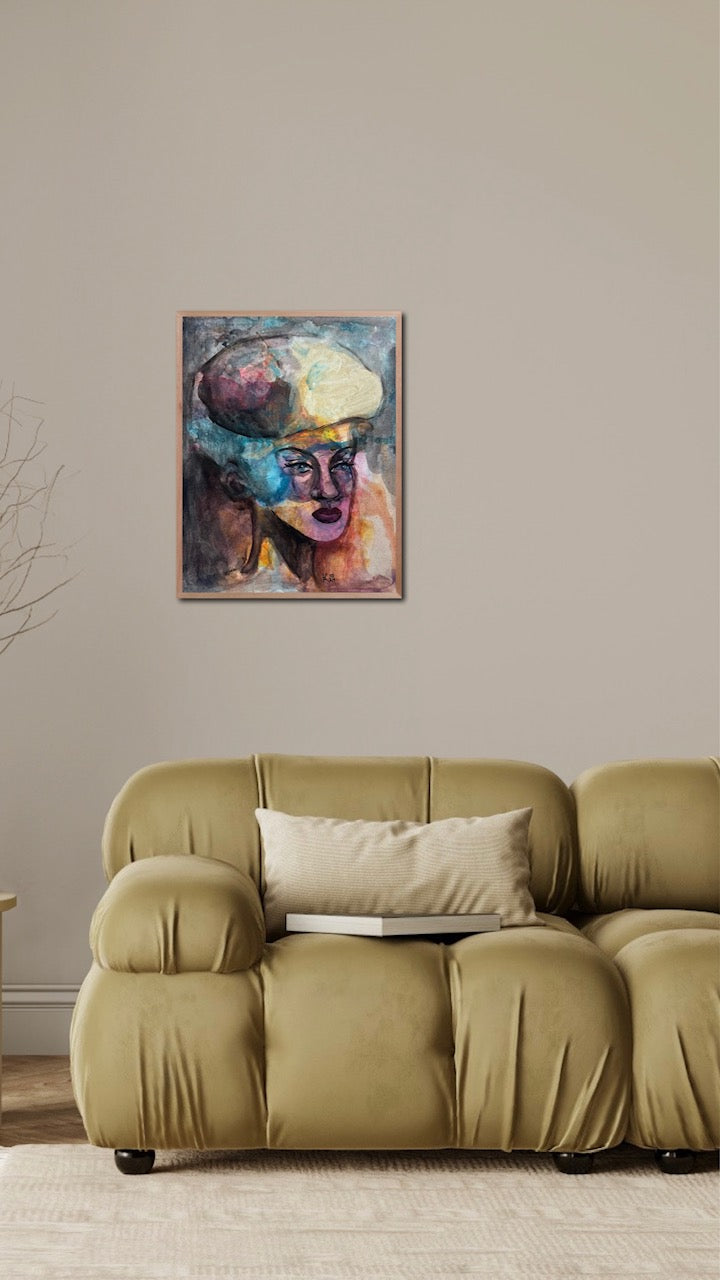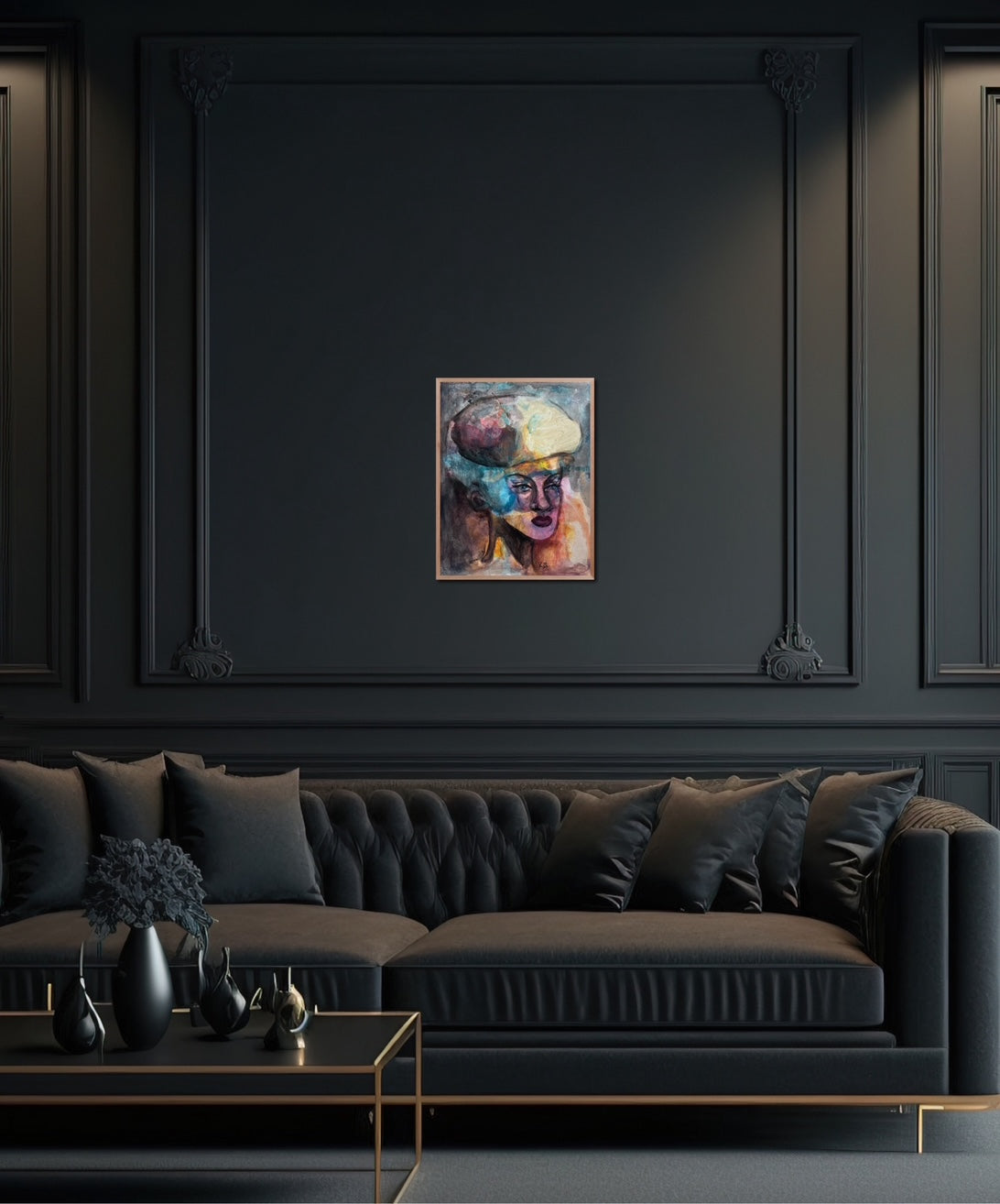 “Stability” reveals a poised female figure grounded in a swirl of movement. Her serene face, sculpted with deliberate, confident strokes, contrasts with the erupting clouds of blue, orange, ochre, and violet that surround her. The monumental, abstract shape above her head resembles both a crown and a storm - capturing the weight of thought and inner power. The composition balances chaos and calm, embodying inner resilience. What captivates is her stillness amidst the flux - this equilibrium is both mesmerizing and meditative, imprinting a sense of strength that lingers.