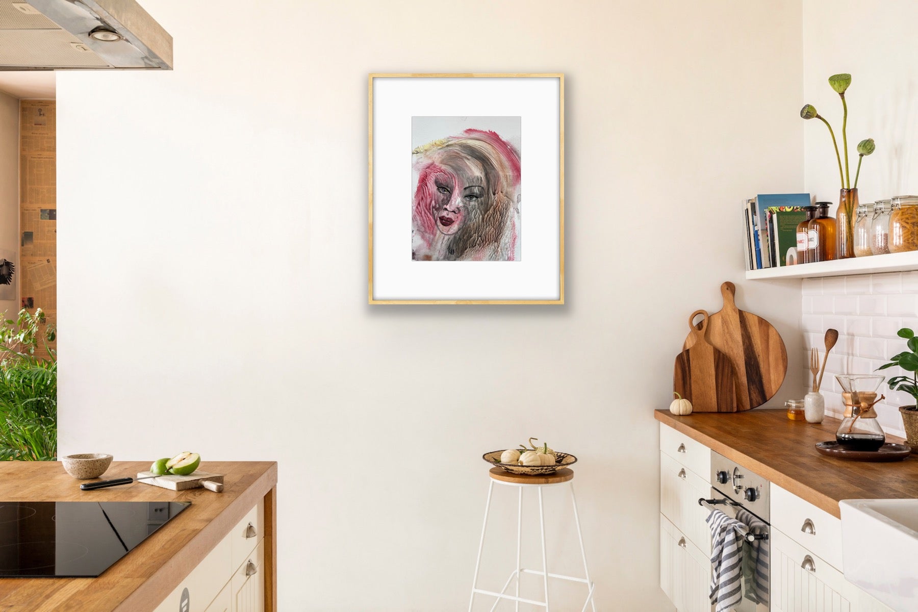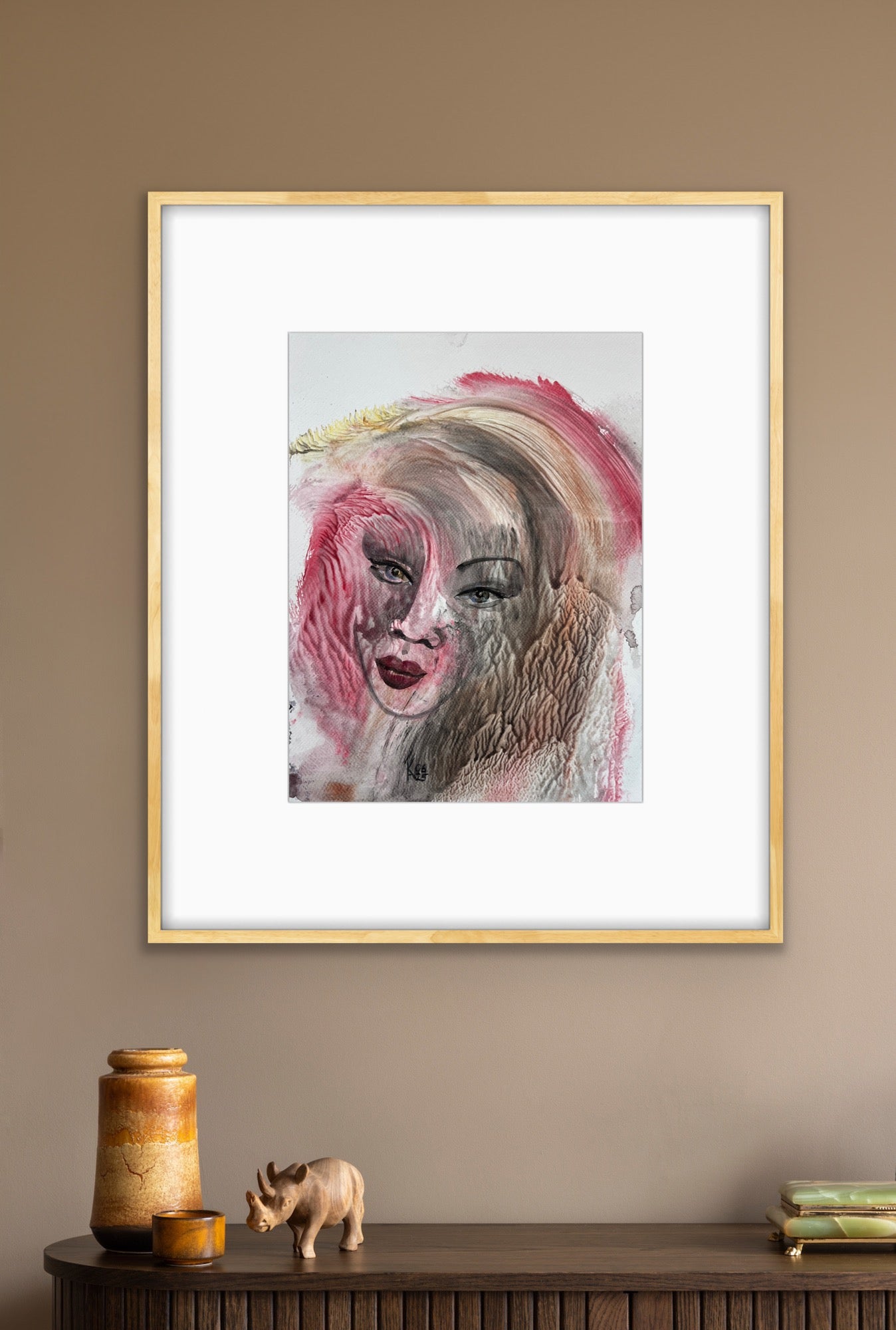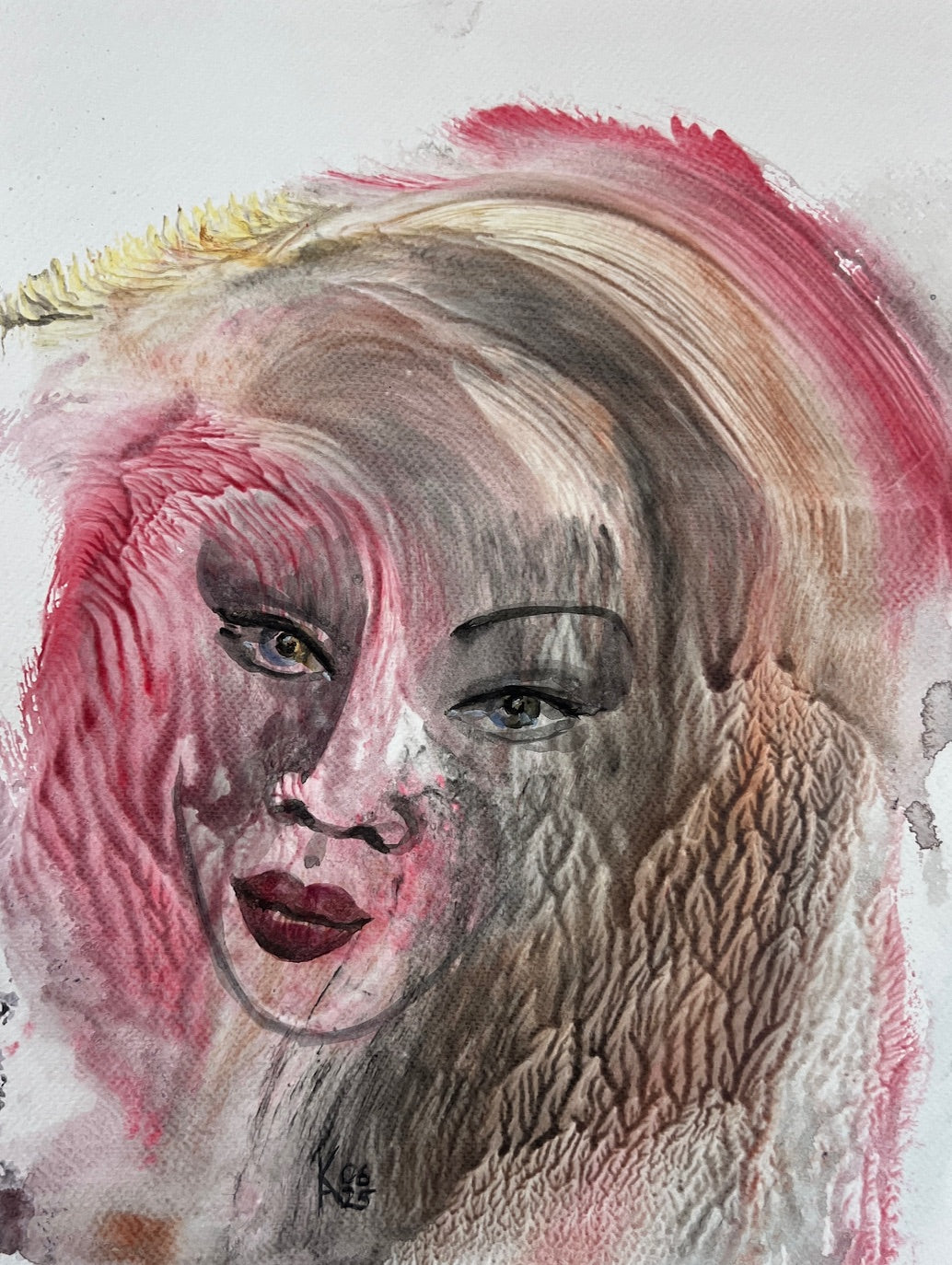 “Summer Dawn” is a poetic fusion of light, warmth, and introspection. The woman’s face emerges through flowing layers of rose, amber, and soft gray tones, blending human emotion with the texture of nature. Her calm gaze carries both mystery and serenity, symbolizing renewal and inner awakening. The brushwork, blending translucency with tactile depth, creates an atmosphere of gentle movement - like the first breath of morning light. This surreal watercolor invites the viewer into a dreamlike balance between fragility and strength.